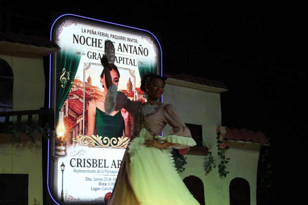 La candidata de la parroquia Rómulo Gallegos, Crisbel Araque. Quien abrió la noche con un impecable paso doble y un traje que recordó la elegancia y picardia de la época antañona.